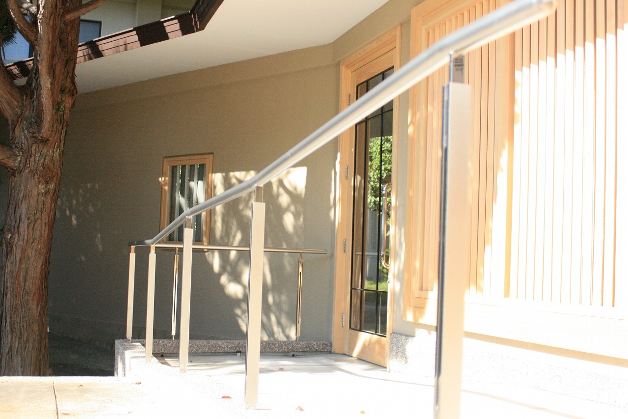 福岡県護国神社 平成25年御鎮座70周年記念事業。 <施工> 株式会社荻田商業建築デザイン事務所 <材料> ステンレス SUS304 FB 丸パイプ <表面仕上> 持ち手部分 ビーズブラスト(shine beads Blast MAKO-1A) 支え部分 鏡面加工+バイブレーションコンビ <特徴> 背面の檜で造られた建具と調和するようなデザイン。 まるで。白銀の糸が宙に舞っているように表現しています。 <使用場所> 手摺 <素材の規格サイズ> 加工品