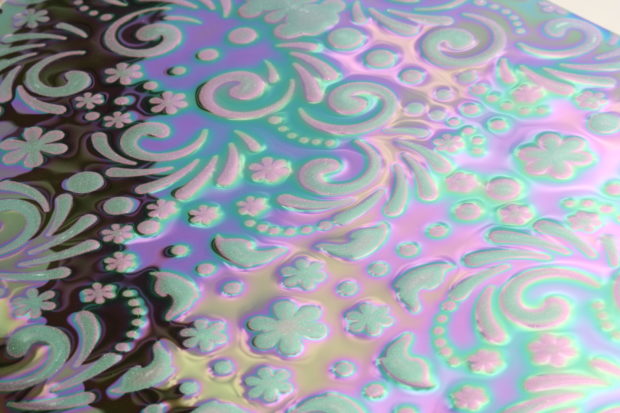 ステンレス表面にケイ素系薄膜を形成して光の干渉で美しい色合いを表現する方法です。